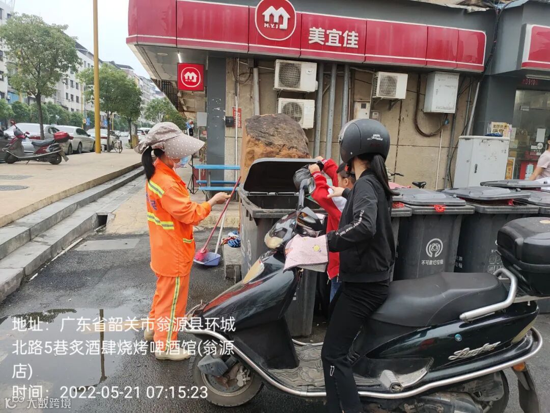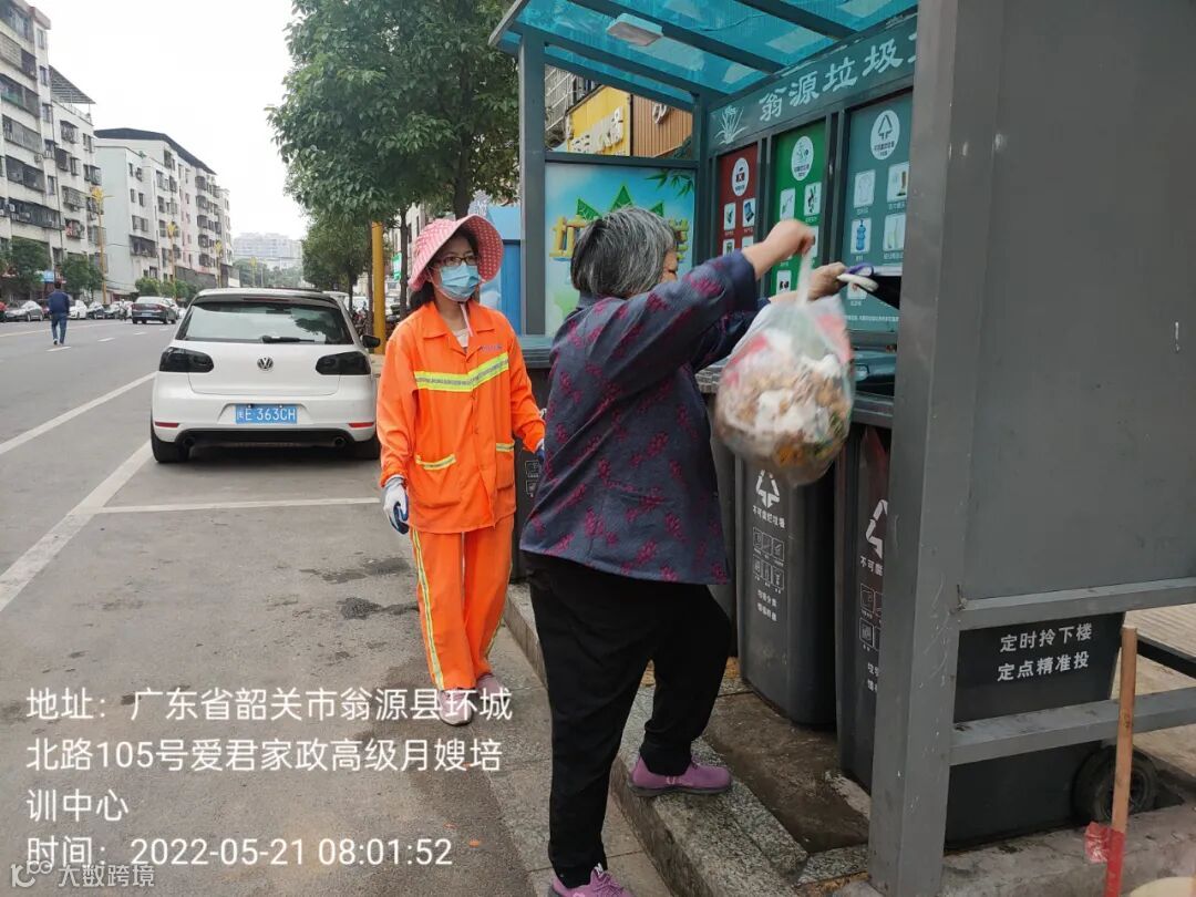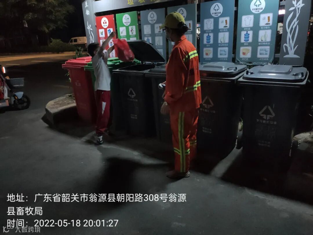 2、垃圾分类劝导员在朝阳路和环城北路各垃圾收集点守点劝导居民自行打开桶盖投放垃圾。