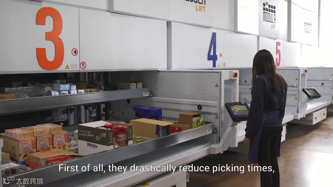 Modula大大缩短了商店员工的拣货时间,他们不再需要到处走动,逐个挑选产品再放到购物袋里,只需要在货柜前点击屏幕就可以一步到位,完成拣选。