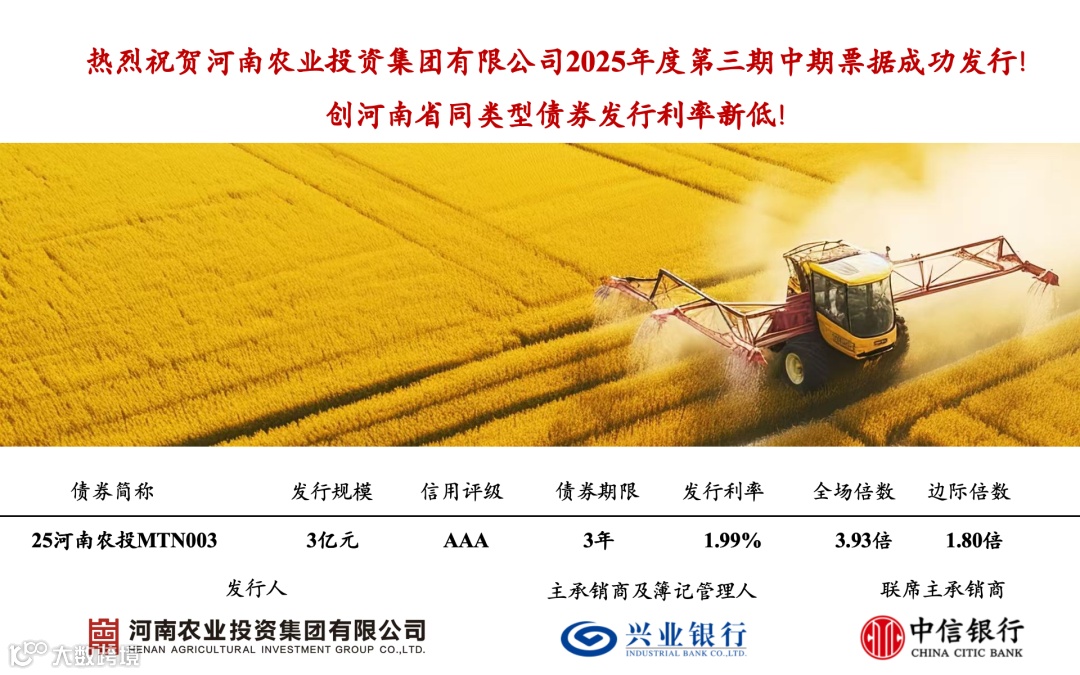 8月26日,河南农投集团成功发行2025年第三期中期票据,发行规模3亿元,期限3年,票面利率1.99%,全场认购倍数3.93倍,创河南省同类型债券发行利率新低。本次发行由兴业银行担任牵头主承销商及簿记管理人,中信银行担任联席主承销商。