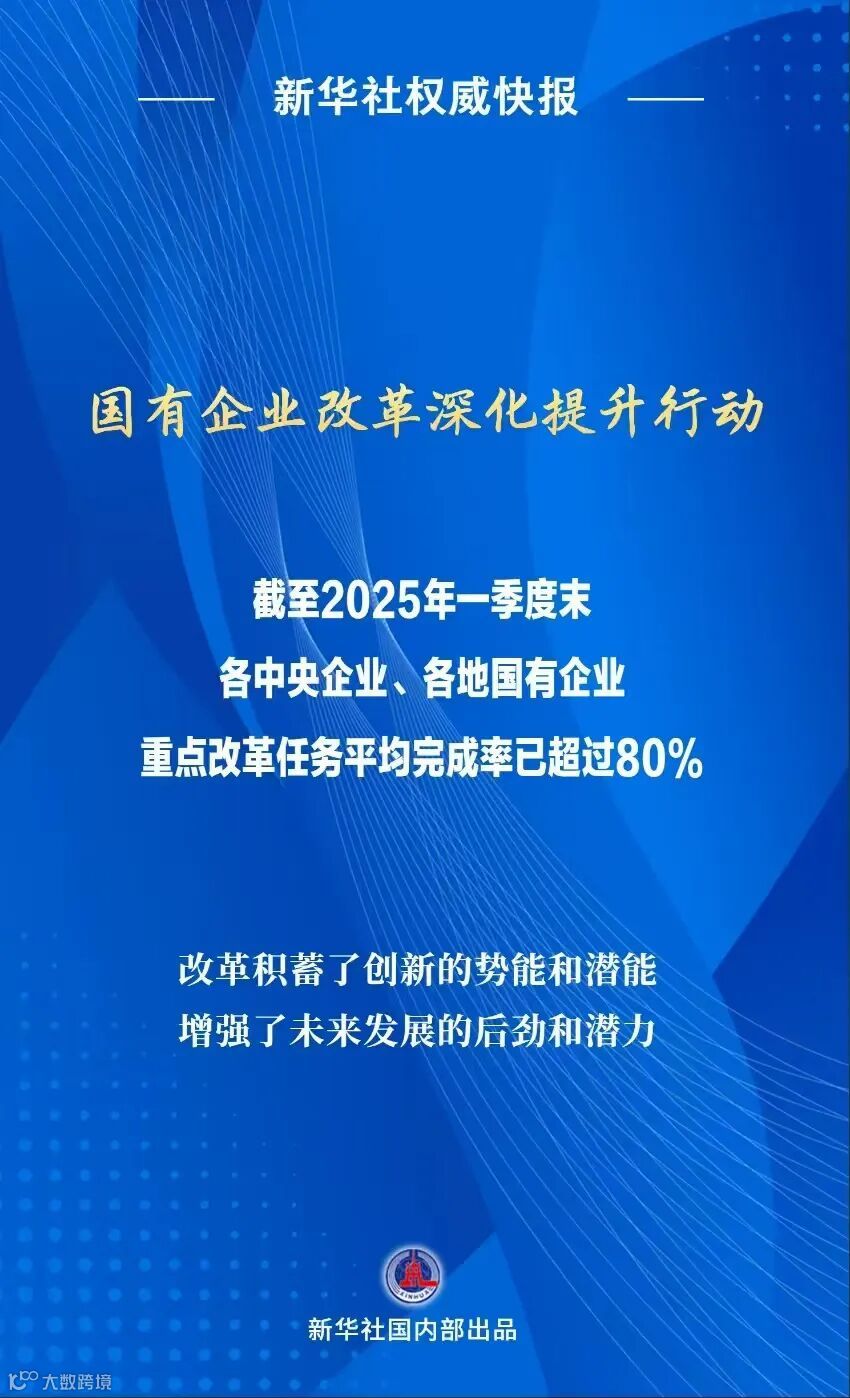 截至2025年一季度末,各中央企业、各地国有企业改革深化提升行动重点改革任务平均完成率已超过80%。