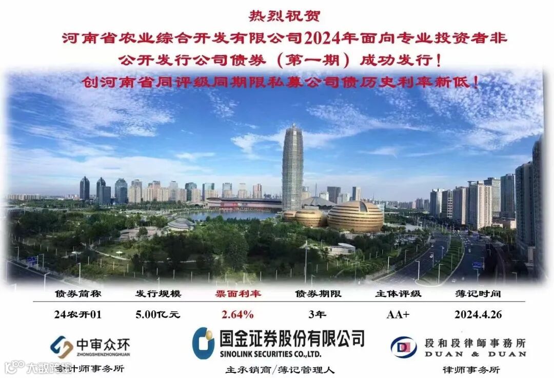 4月26日,河南省农业综合开发有限公司(以下简称“河南农开公司”)成功发行2024年度面向专业投资者非公开发行公司债券(第一期),实现今年在资本市场的“开门红”。本期公司债由国金证券股份有限公司担任主承销商,发行规模5亿元,债券期限3年期,全场认购倍数2.52倍,票面利率2.64%,创河南省同评级同期限私募公司债历史利率新低。