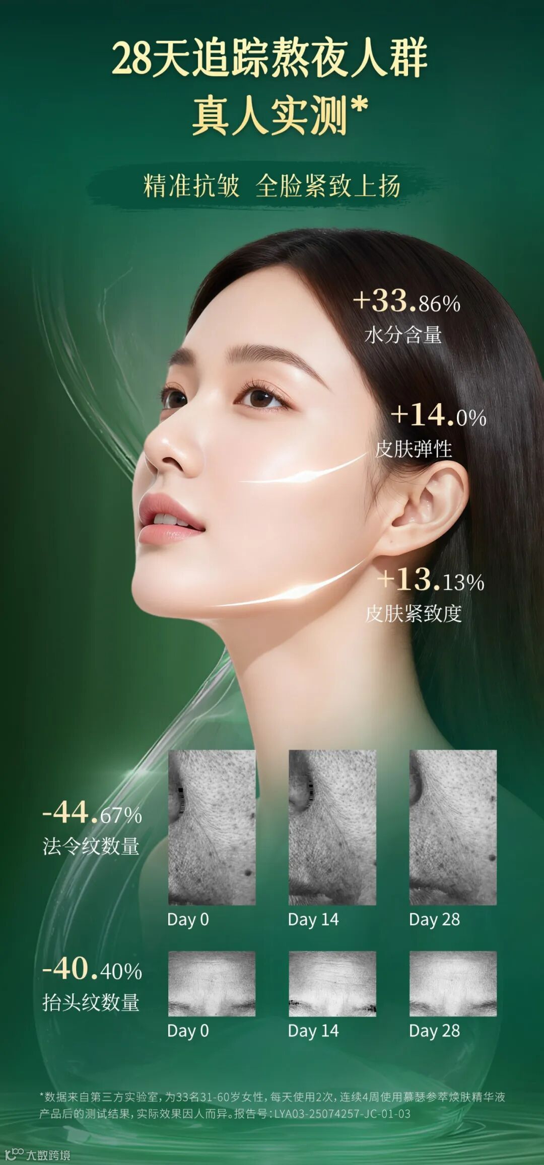 [3]数据来自第三方实验室,为33名31-60岁女性,每天使用2次,连续4周使用慕瑟参萃焕肤精华液产品后的测试结果,实际效果因人而异。报告号:LYA03-25074257-JC-01-03