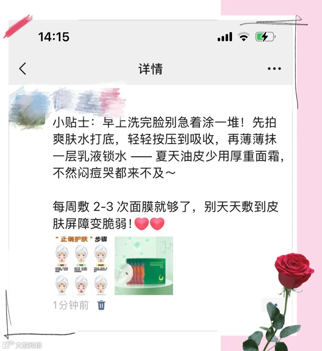 定期在朋友圈发布健康、护肤小知识,如 “夏季高温易导致皮肤油脂分泌旺盛,正确的清洁步骤与控油产品的选择是保持肌肤清爽的关键”,通过展现专业度,启发读者,让客户感受到我们是在真心为他们提供帮助,而非单纯地推销产品。
