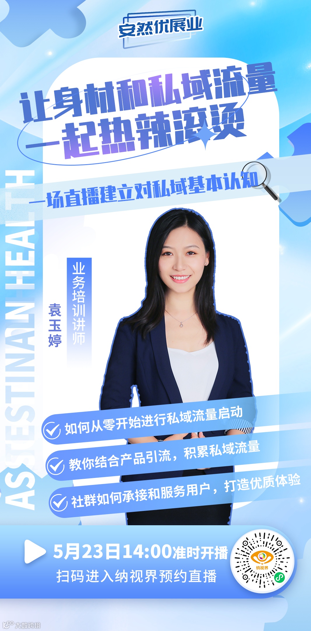 本期安然优展业直播,我们邀请了国家高级健康管理师、国家高级美容师袁玉婷老师,为大家带来如何建立对私域的基本认知,让身材和私域流量一起热辣滚烫!