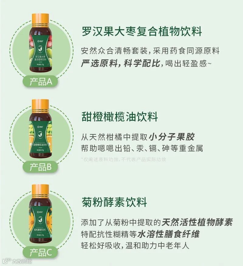 采用产品A罗汉果大枣复合植物饮料、产品B甜橙橄榄油饮料、产品C菊粉酵素饮料,三者协同增效。