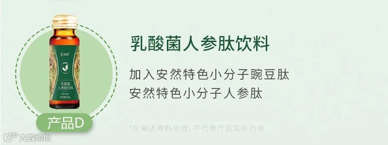 采用产品D乳酸菌人参肽饮料,加入安然特色小分子豌豆肽、安然特色小分子人参肽。