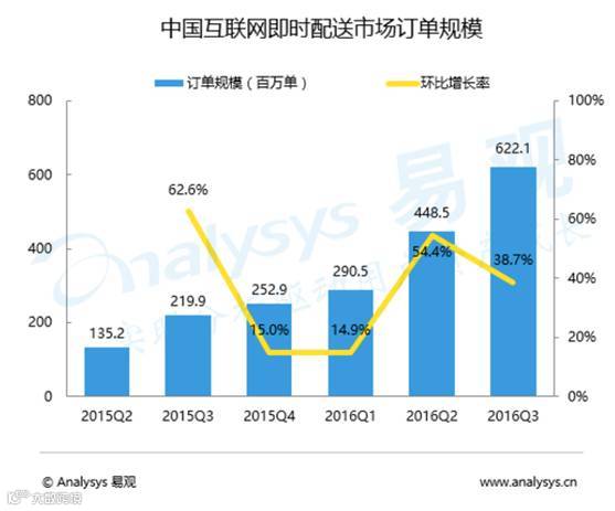 报告显示,国内即时配送市场规模在第3季度继续保持稳步增长,环比增长率达38.7%。易观分析认为,伴随着物流及餐饮外卖行业的的增长态势,即时配送市场面临着巨大的市场空间,将迎来快速扩张。