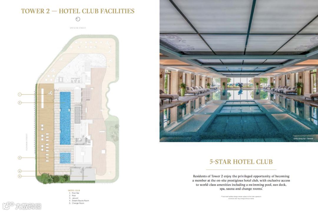 11层以下为五星级酒店,配备豪华酒吧、健康中心。住户可注册会员享用其泳池。除此之外,在第4层更配备室内和室外餐饮、烧烤区和公共会客厅、电影院、健身中心。