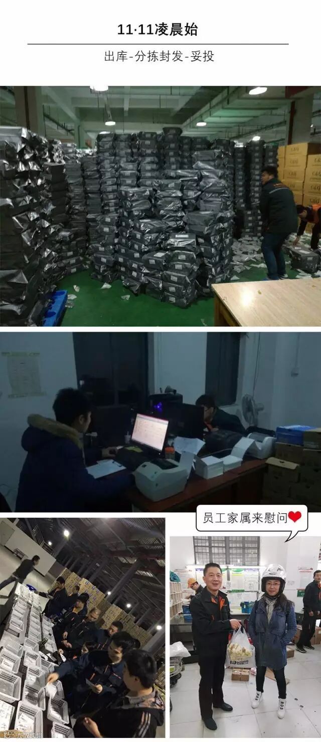 从11月11日凌晨00:00分开始,很多客户开始源源不断发货,短短一晚上,广州区许多网点已经堆件如山,场面整齐壮观。