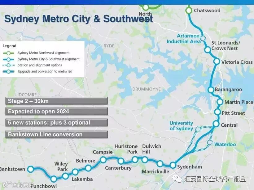 这条铁路线是规划总长度66公里SydneyMetro计划的重要组成部分,该计划起点是悉尼西北增长中心的Cudgegong Road车站,经过Epping、Chatswood,通过新建的第二跨海隧道进入city,再折向西最终到达Bankstown。
