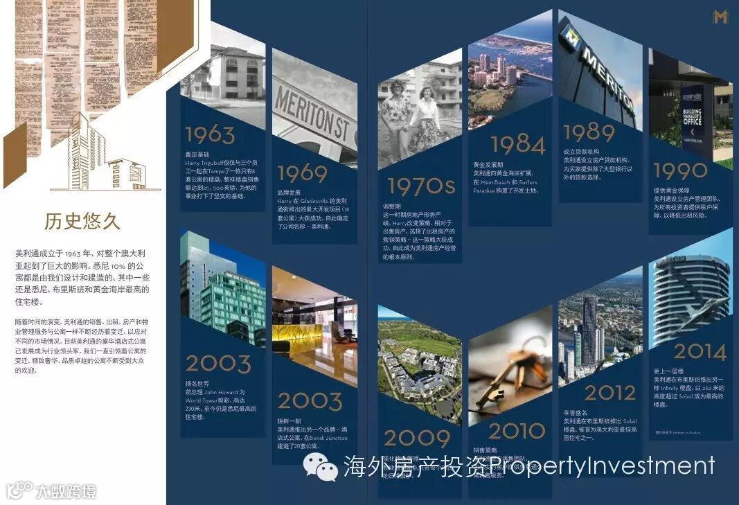 美利通(Meriton )成立于1963 年,公司总部设在悉尼市中心的Meriton Tower。凭借着灵活多变的市场策略和精益求精的工作态度,逐渐成长为澳大利亚乃至于南半球首屈一指的发展商之一。开发足迹遍布悉尼,黄金海岸和布里斯班。四十几年来,美利通(Meriton)公司已经为澳洲本地居民和中国移民修建了55,000 多套住宅。成了澳大利亚在悉尼和黄金海岸最大的物业开发公司之一。