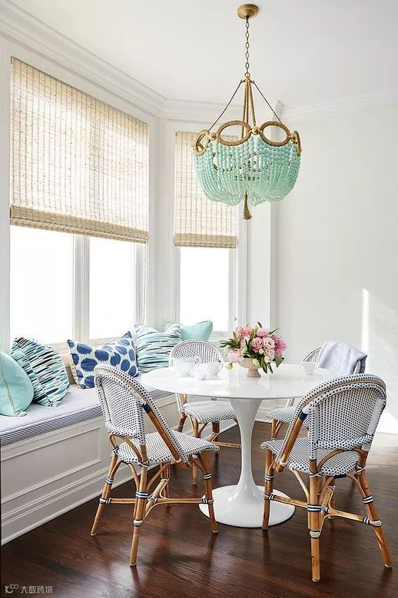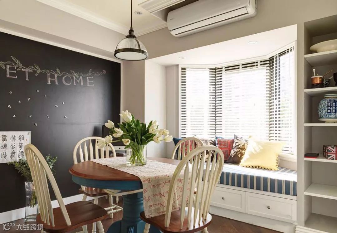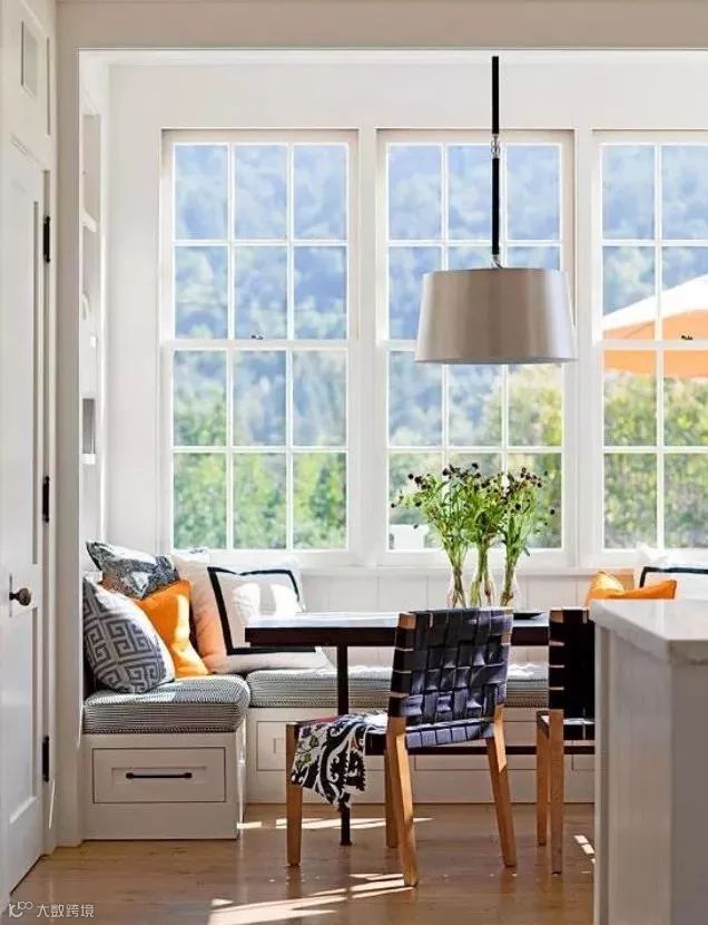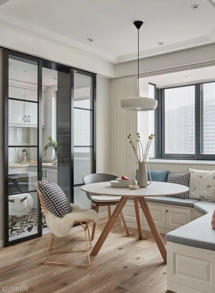 飘窗变身卡座,配合餐桌椅形成舒适的休闲区域,既美观也可增加一定的餐厅收纳。功能既完整,也不会影响动线的顺畅。