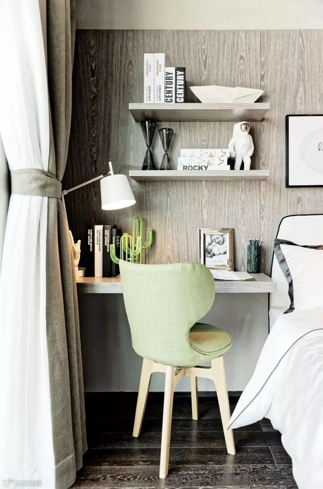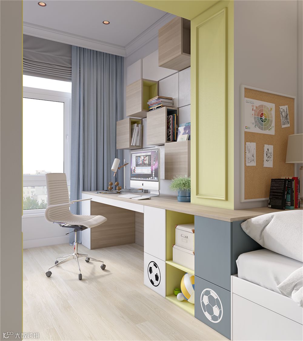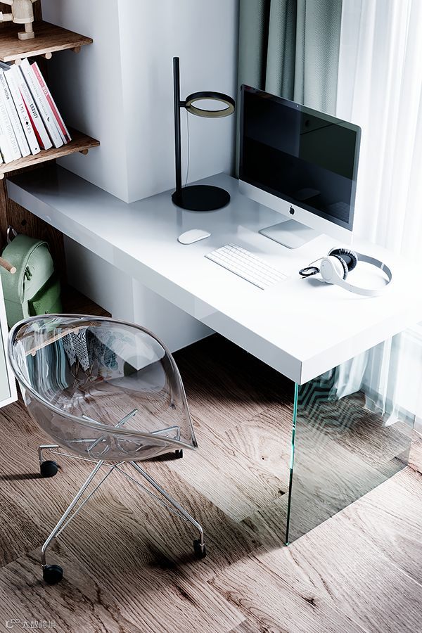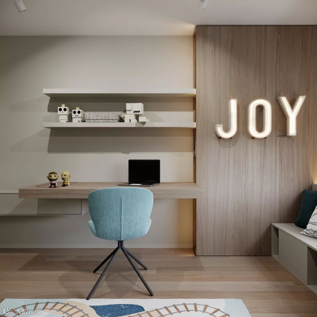单张的书桌已不能满足多重的使用需求,在转角的位置打造一个书柜、书桌一体的设计, 可谓非常实用了。
