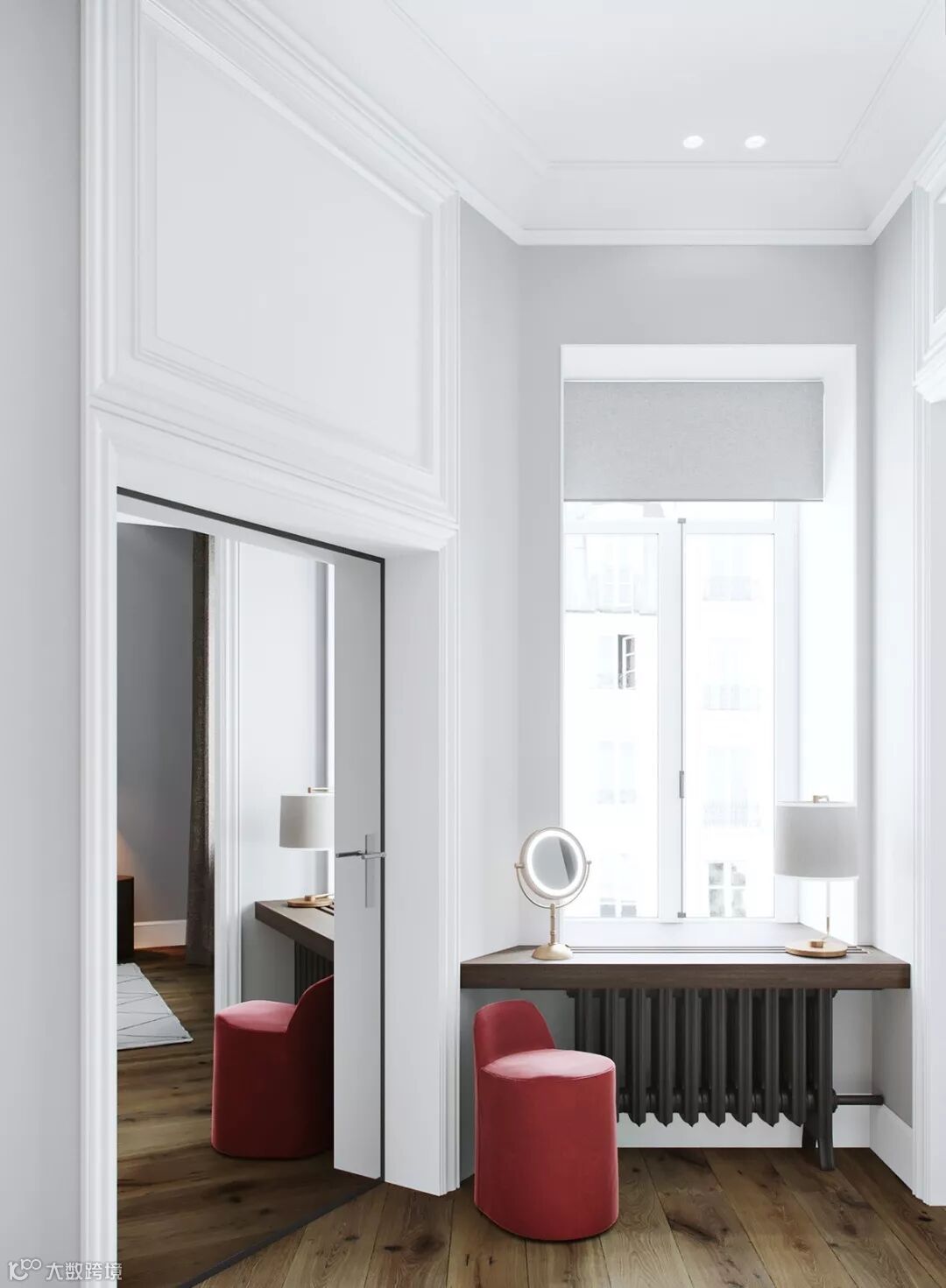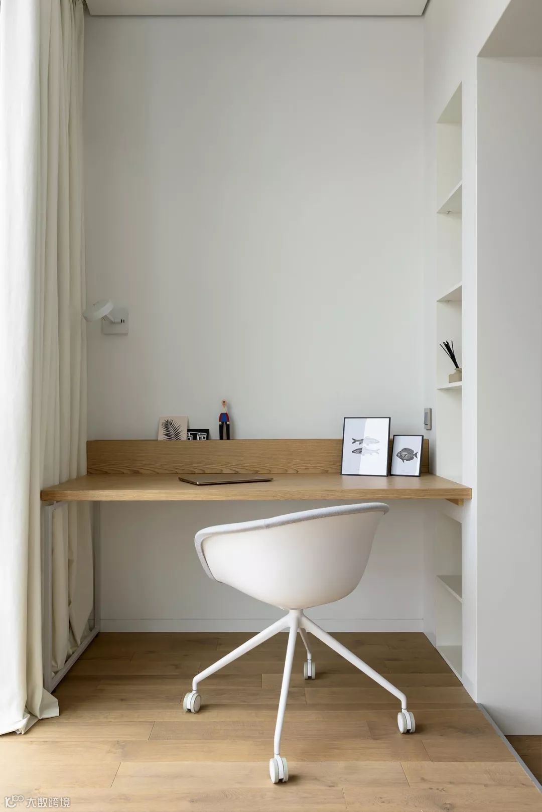 这样自然形成一个凹进去的空间,嵌入隔板或是书桌,再加入壁灯,就大功告成了。