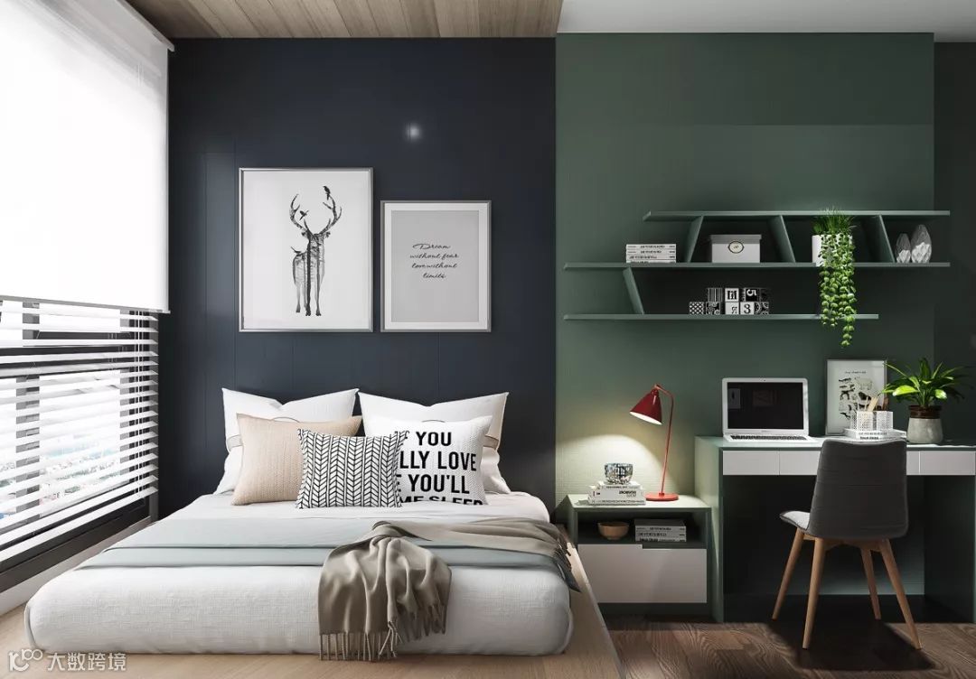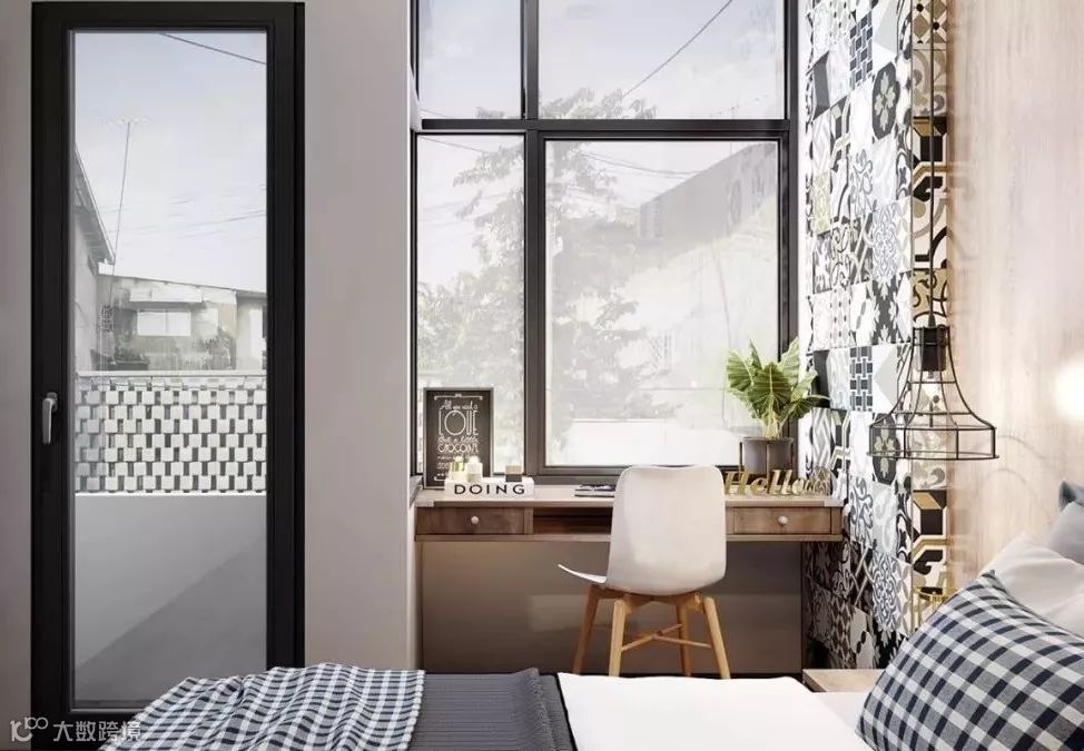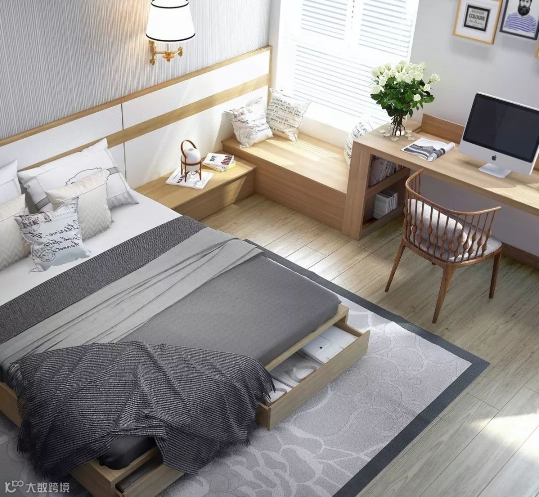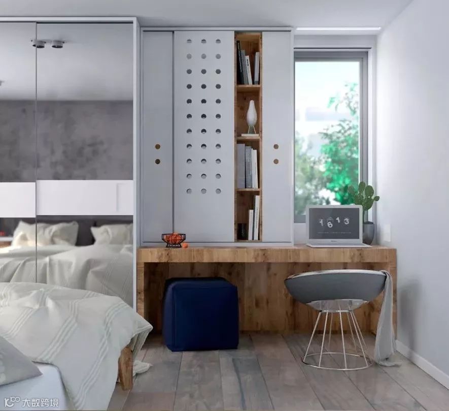 在床头位置设计一款小书桌,既能办公,还可以当梳妆台使用。