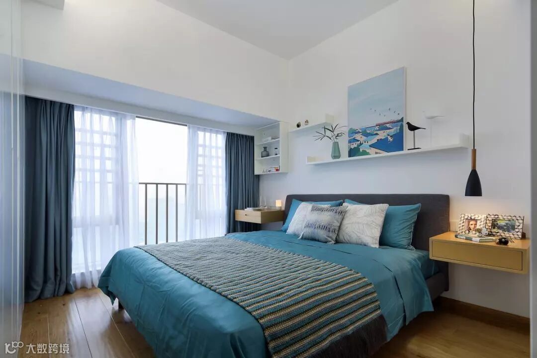 卧室整体设计以白色为主,蓝色用来点缀,简单、素雅又不失质感。