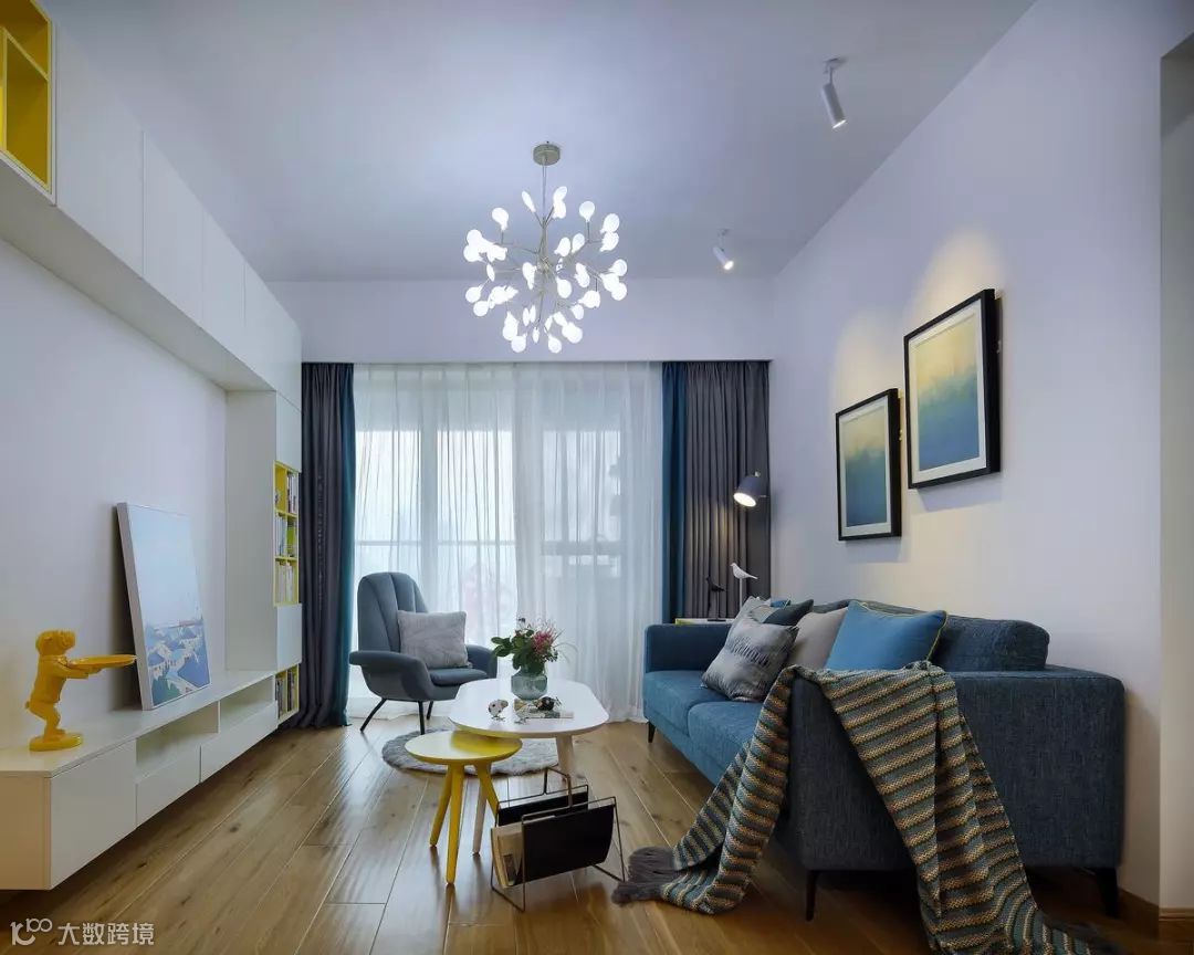 整个客厅的配色比较多样化,湖蓝色布艺沙发,蓝色的窗帘相互呼应,让空间多了一些跳跃感。