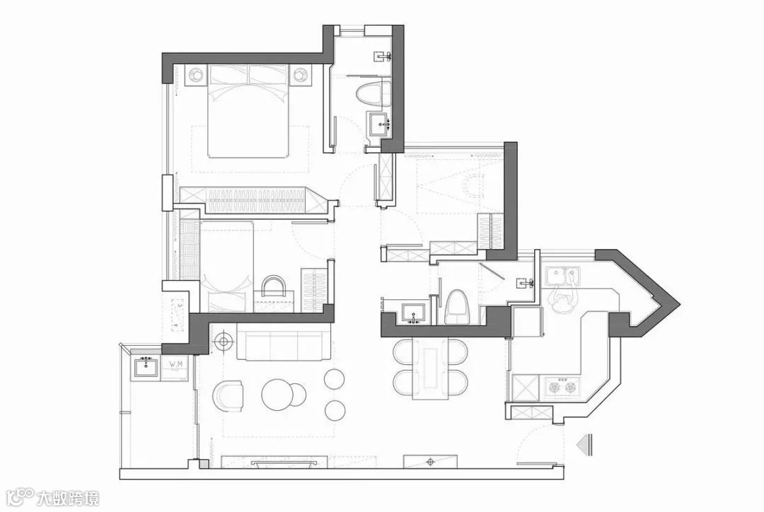 不规则的厨房空间,橱柜沿着墙面来布置,留出更多的活动空间,白色的柜体和灰色的台面结合,让厨房看起来更加简洁。