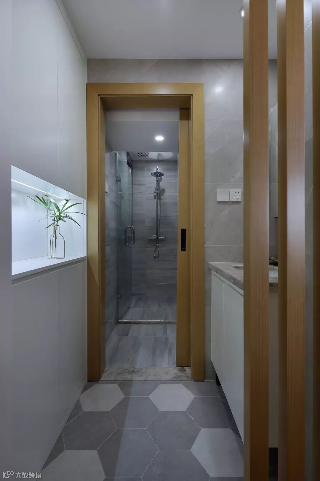 卫生间内部以灰白色为主,把洗手台放在了门外,做了彻底的干湿分离,更加适合小户型卫生间。嵌入式的柜子与镜柜的设计,增加了储物空间。
