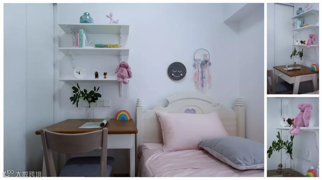 次卧儿童房,配色选择可爱的公主粉,用书桌来代替床头柜,满足读书、学习的需求。