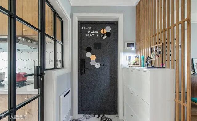 在玻璃隔断下打造专门的收纳柜,也可以起到保护隐私的作用。温暖的客厅灯光也补充了玄关的光亮需求。