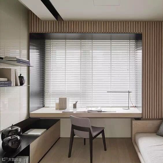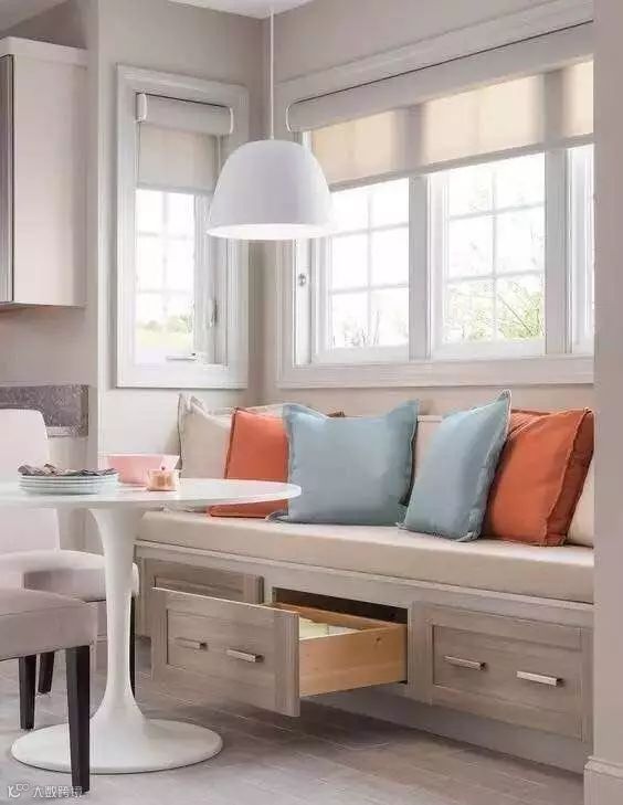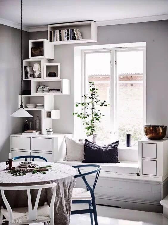 靠窗位置作为独立的读书一角也是极其惬意的,闲暇时刻,坐在窗边看看书,感觉整个人都得到了升华。底部或者左右两侧隔成几个收纳空间,收纳杂物很强大哦,家里宽敞又明亮~