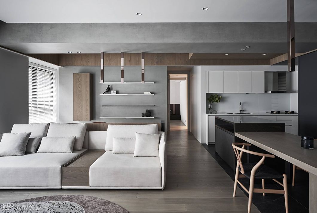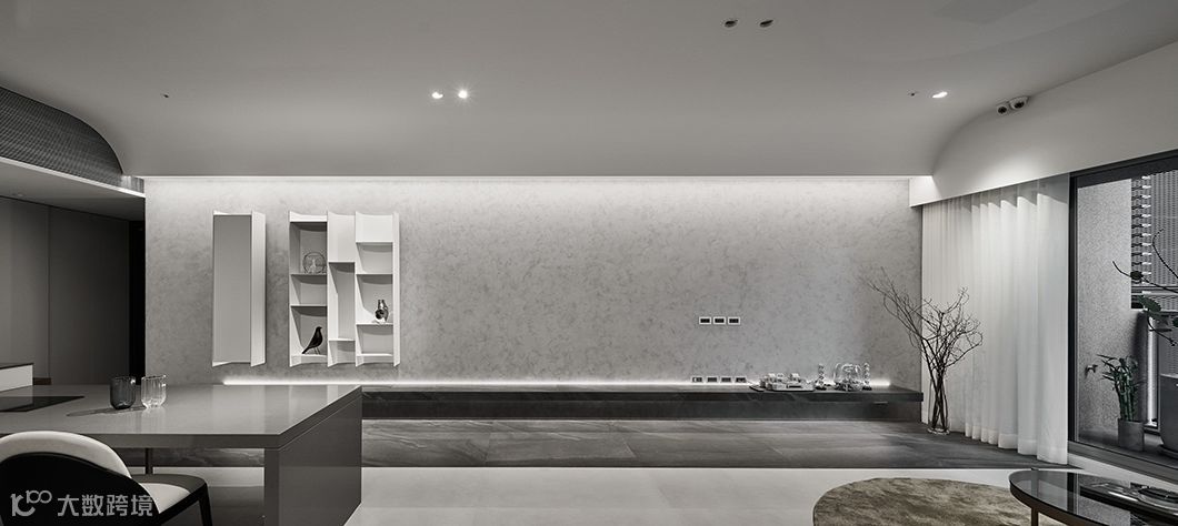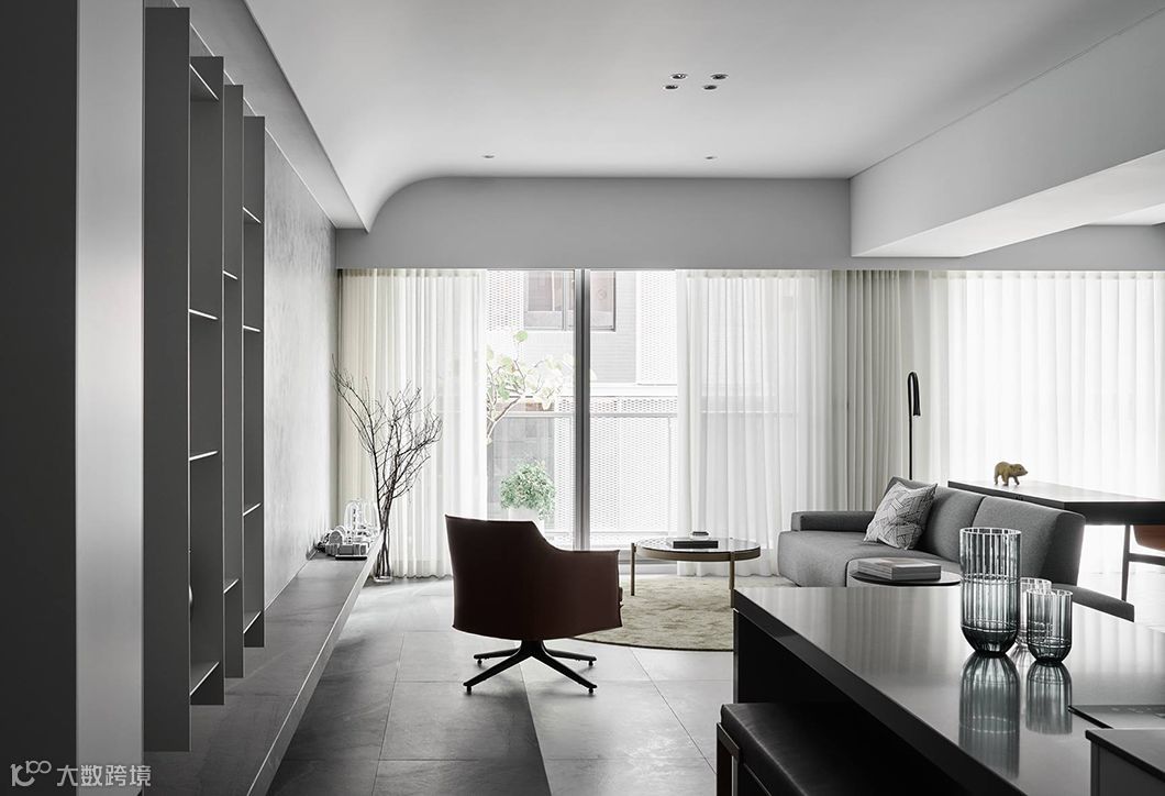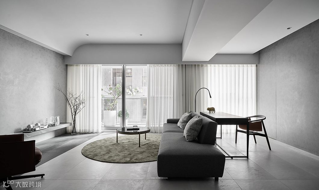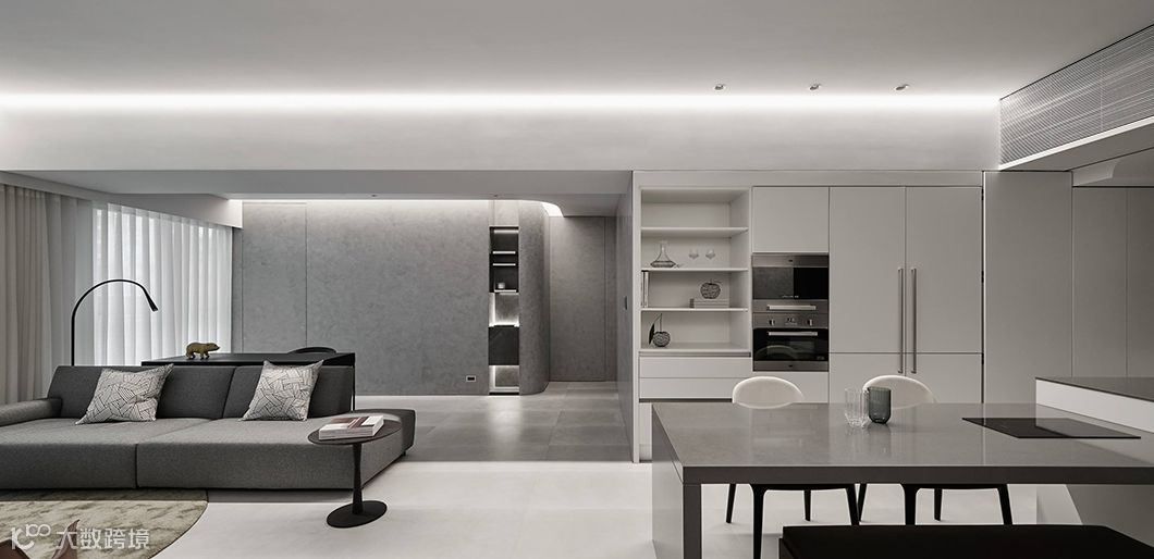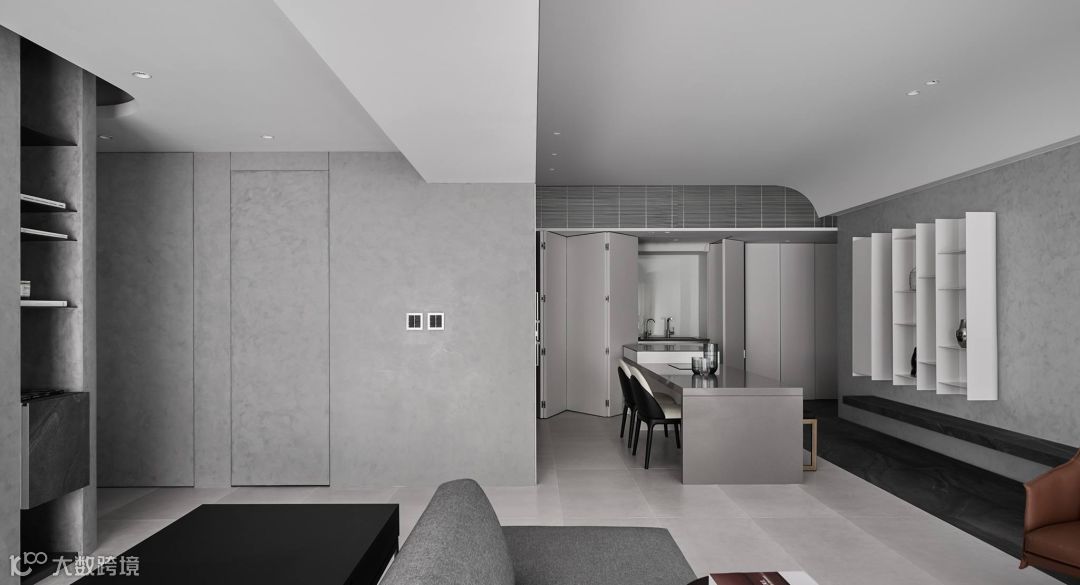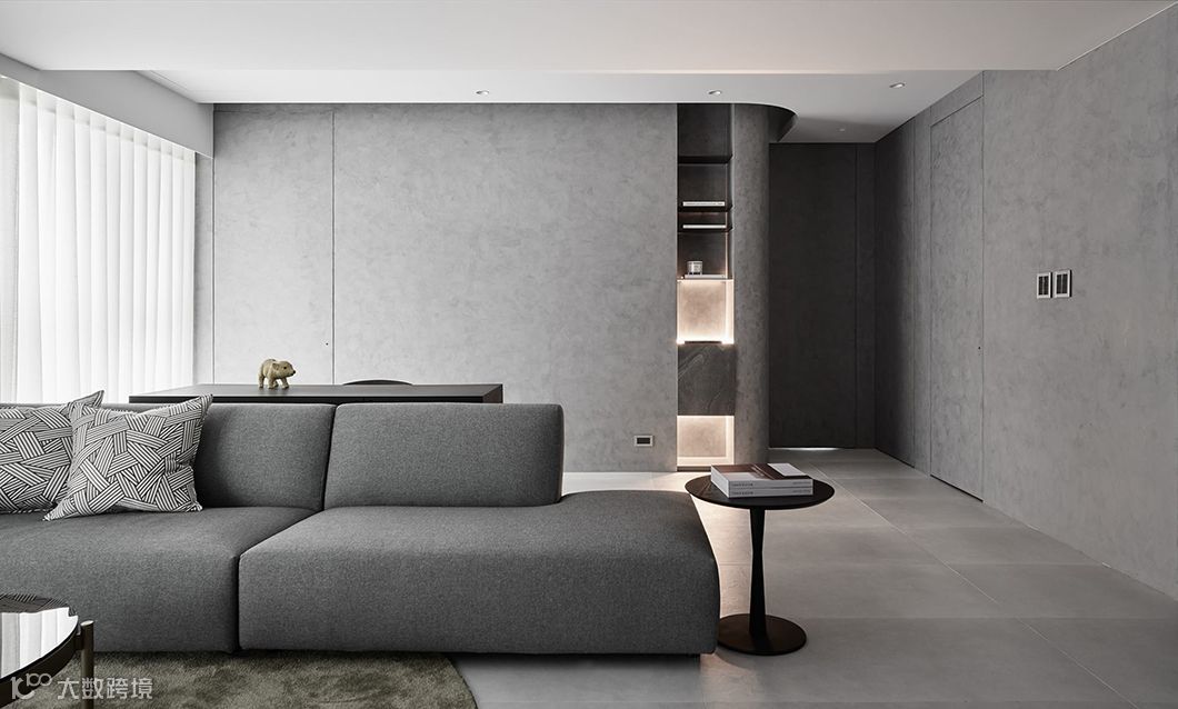 当生硬的墙体被重新定义在空间中,运用开放空间超大化的组成,暗示着公共空间与私密空间的重新界定,可变动的墙体串连更多生活情境的弹性。型态上弧形的柔、量体上无彩的灰、木头与布料的温度,藉由光影的变化与渲染,让空间中产生时间的轨迹,静寂素雅却充满故事。
