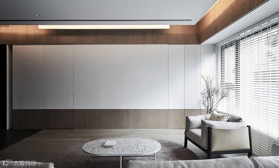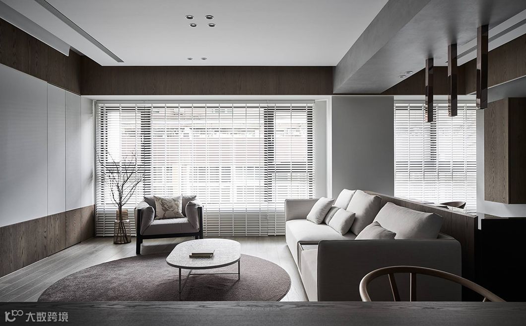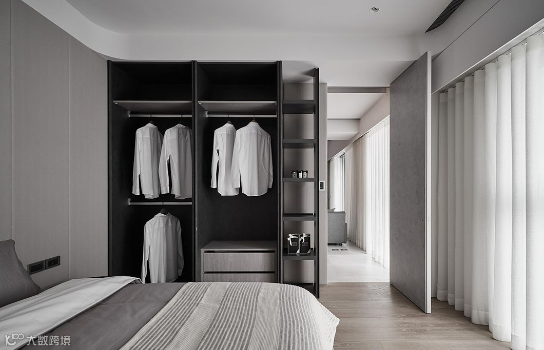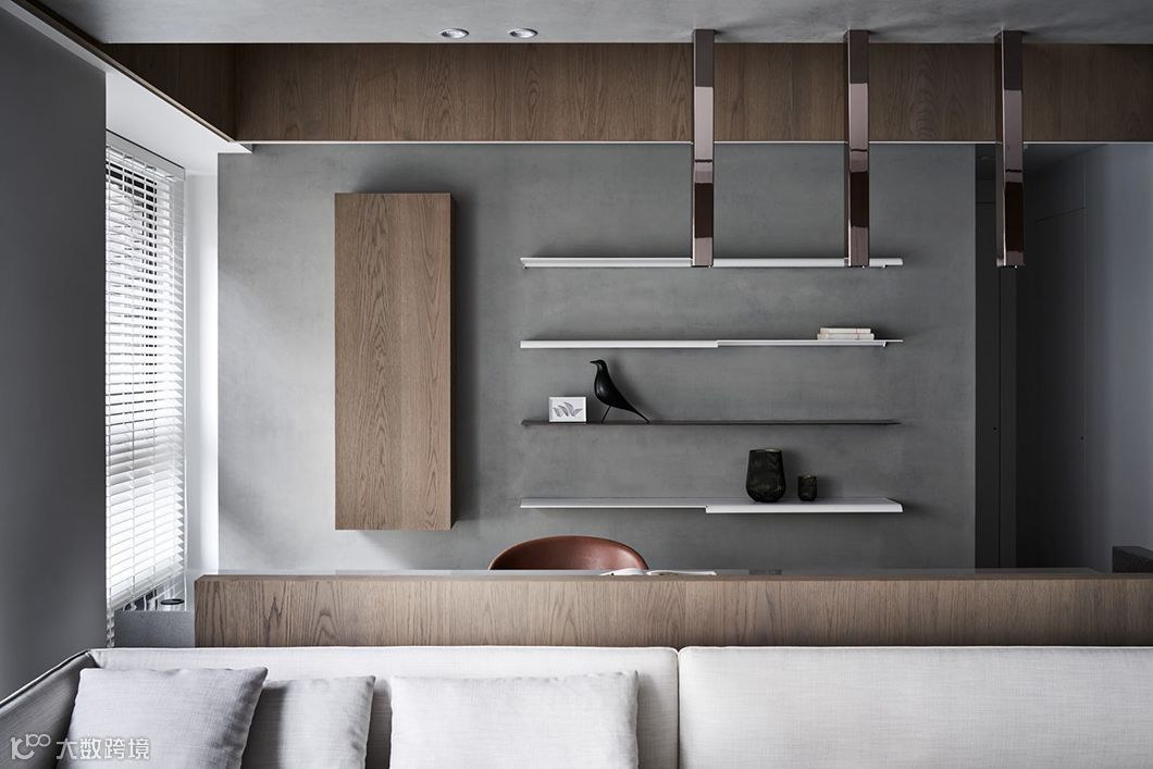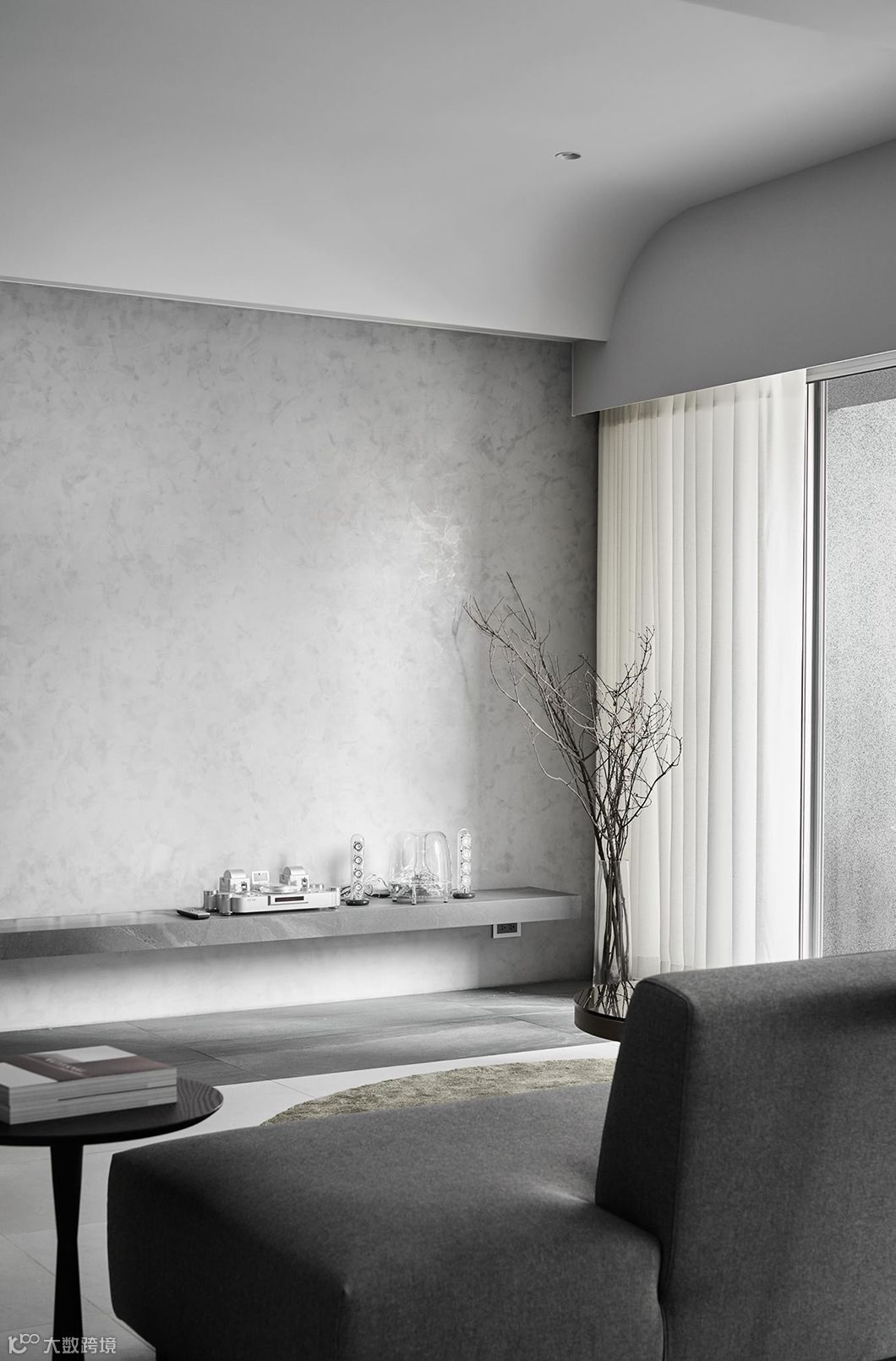 当生硬的墙体被重新定义在空间中,运用开放空间超大化的组成,暗示着公共空间与私密空间的重新界定,可变动的墙体串连更多生活情境的弹性。型态上弧形的柔、量体上无彩的灰、木头与布料的温度,藉由光影的变化与渲染,让空间中产生时间的轨迹,静寂素雅却充满故事。