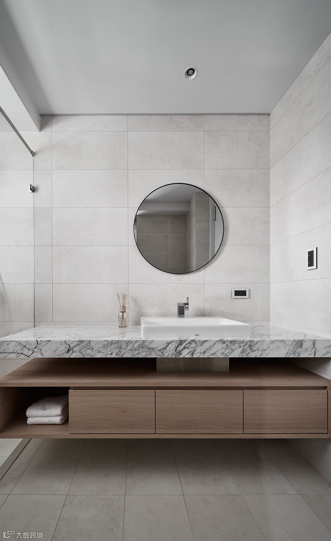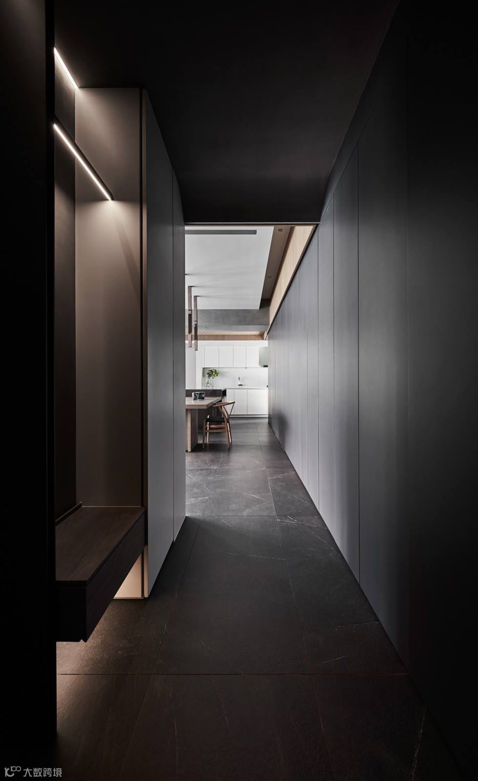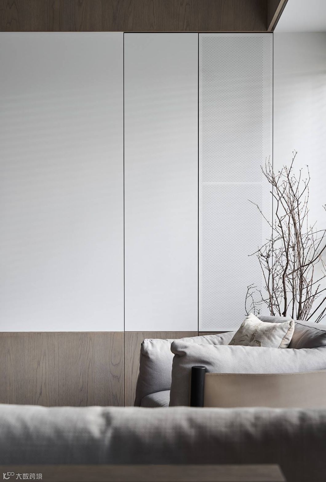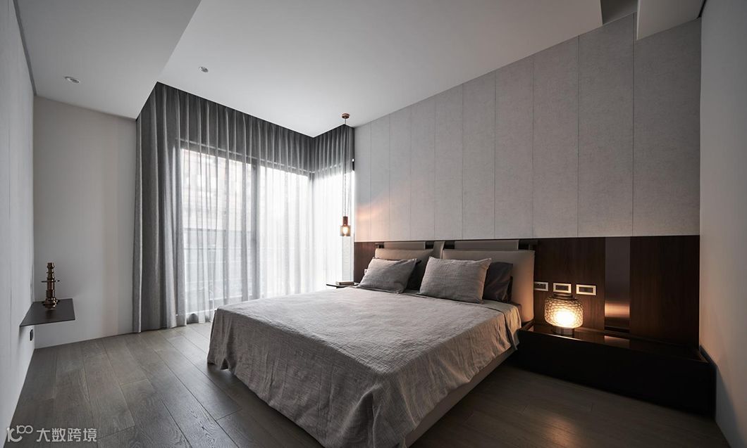 当生硬的墙体被重新定义在空间中,运用开放空间超大化的组成,暗示着公共空间与私密空间的重新界定,可变动的墙体串连更多生活情境的弹性。型态上弧形的柔、量体上无彩的灰、木头与布料的温度,藉由光影的变化与渲染,让空间中产生时间的轨迹,静寂素雅却充满故事。