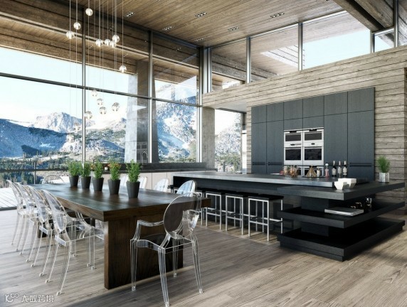 14 | 是饭厅还是大堂?设计联都有点糊涂了。几何造型的餐椅与实木餐桌形成了有趣的对比,弧形交缠的天花梁则显得个性十足,极具乡村风格。