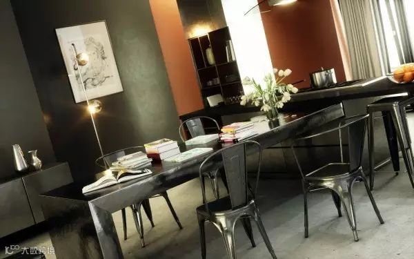 16 | 餐桌和椅子都是金属打造而成,颇有工业风格。