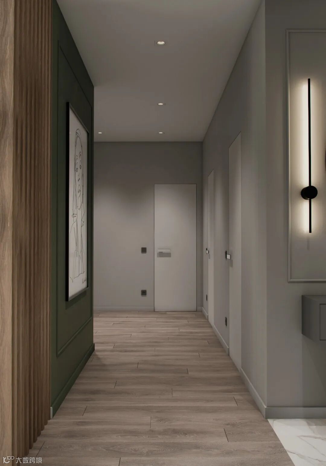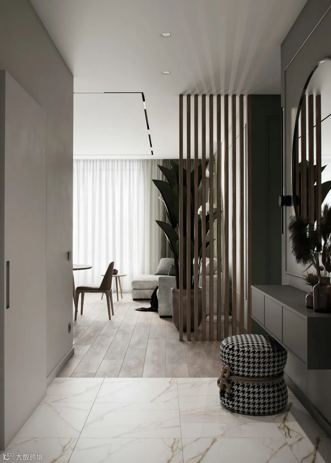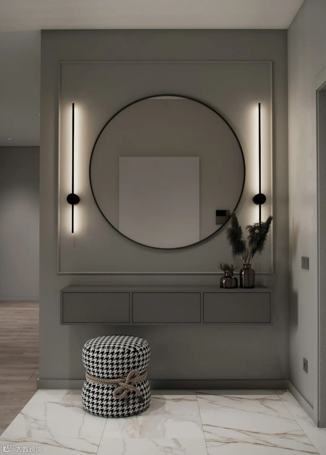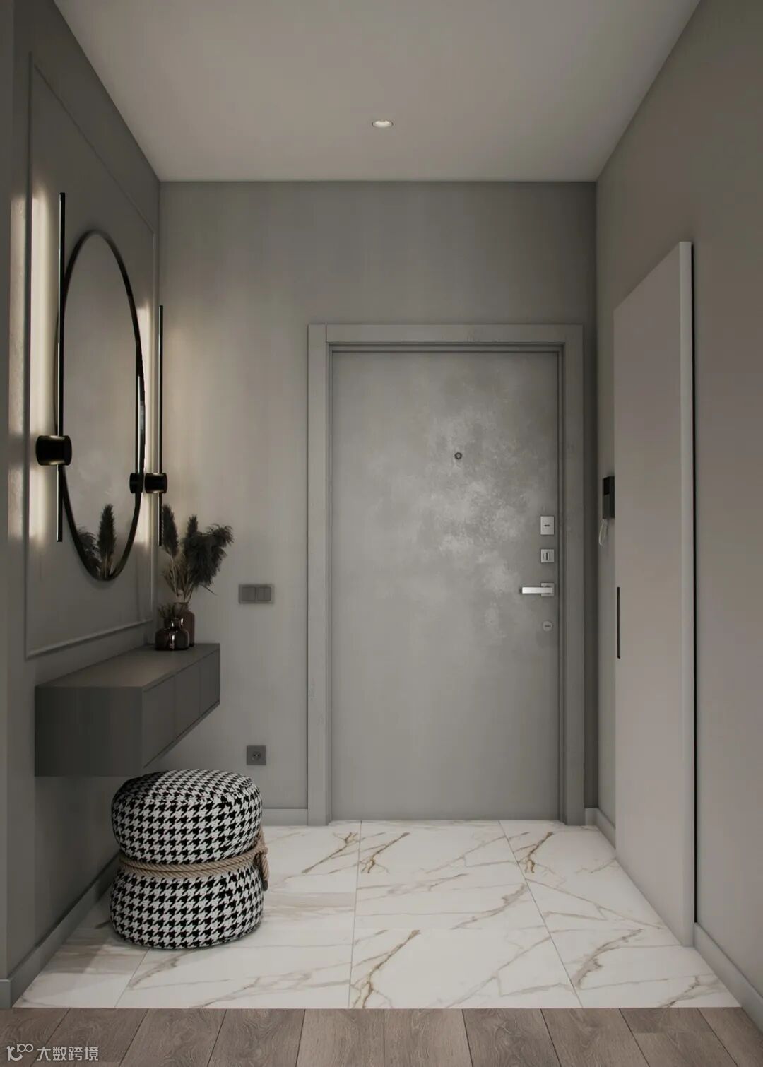 入户玄关,以灰色为主色调,收纳柜、穿衣镜、换鞋凳,简约有层次,美感十足,同时也显得高档多了。