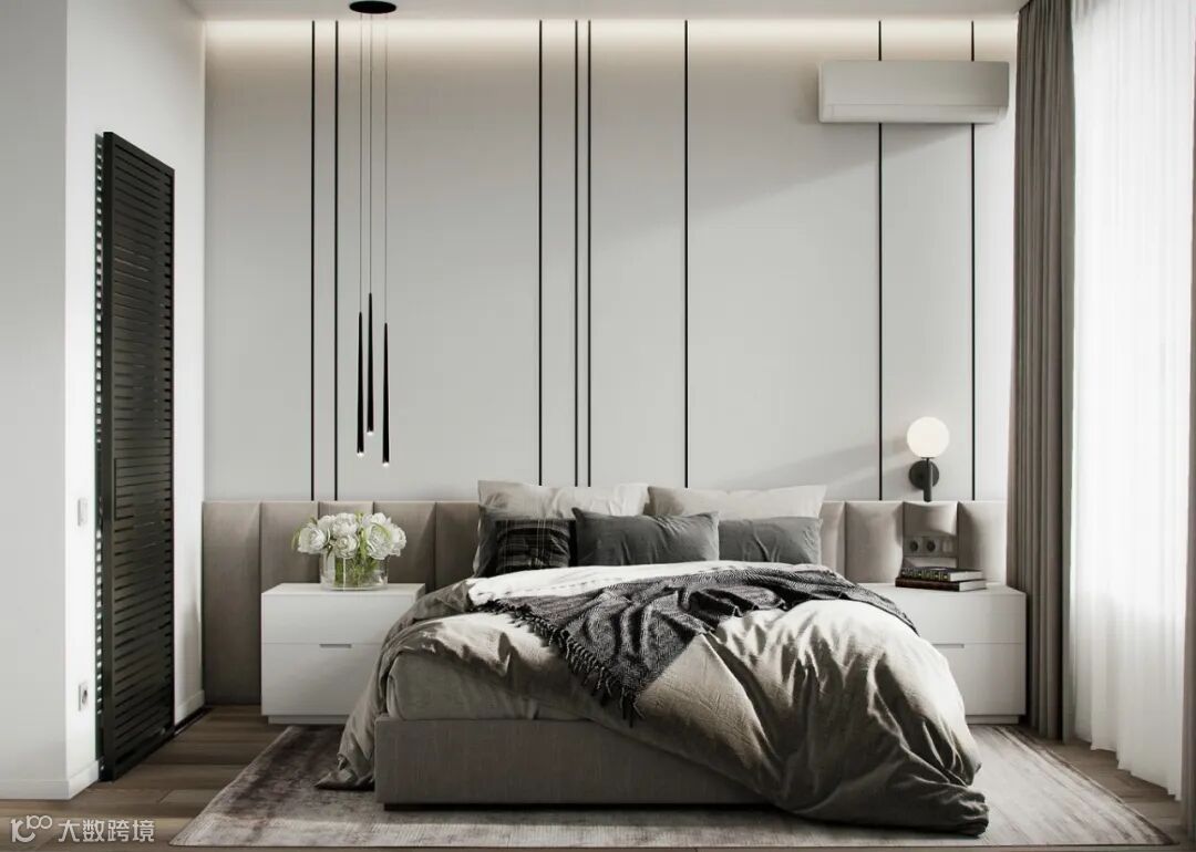 主卧床头背景墙采用大面积的白色饰面,然后加了黑色条状饰面来搭配,显得个性前卫,富有设计感,所以材料与颜色的搭配,白色的透光帘藏在飘窗中,深色的遮光帘则安装在卧室内,这种窗帘的安装似乎让卧室显得更大气。