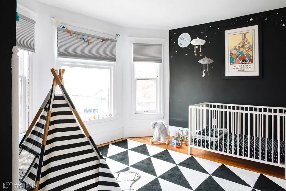 黑板漆+菱格地毯+条纹帐篷的组合,有趣又活泼。