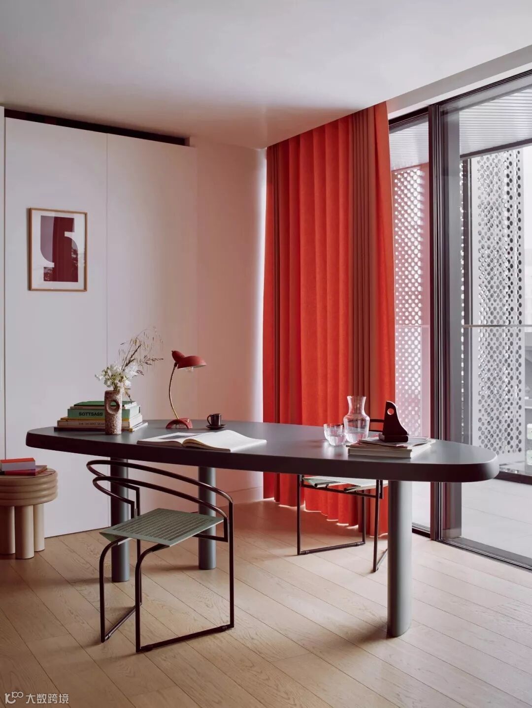 椭圆长桌+几何花瓶,再搭配上空间中几抹舒服的红,整体看起来非常年轻,有活力。