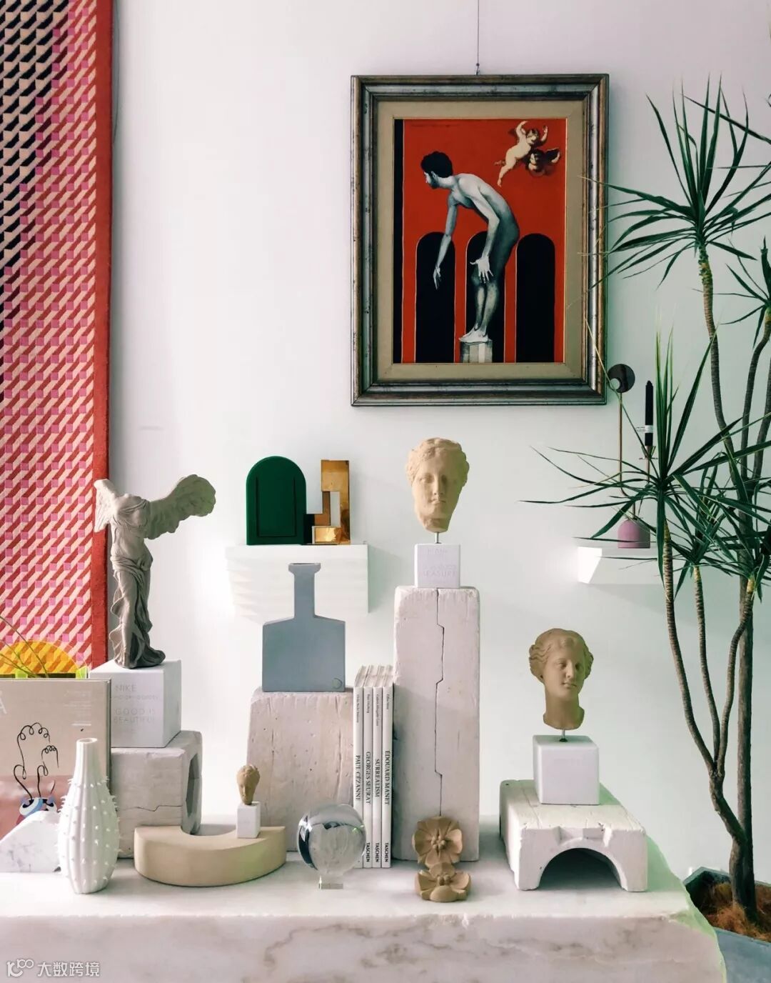 墙面的挂画、挂毯通过色彩一下抓住了人的眼球。而靠墙的桌上,通过把不同的高度,错落地摆放着雕像和几何花瓶,层次分明,很有空间感,实在是高手。