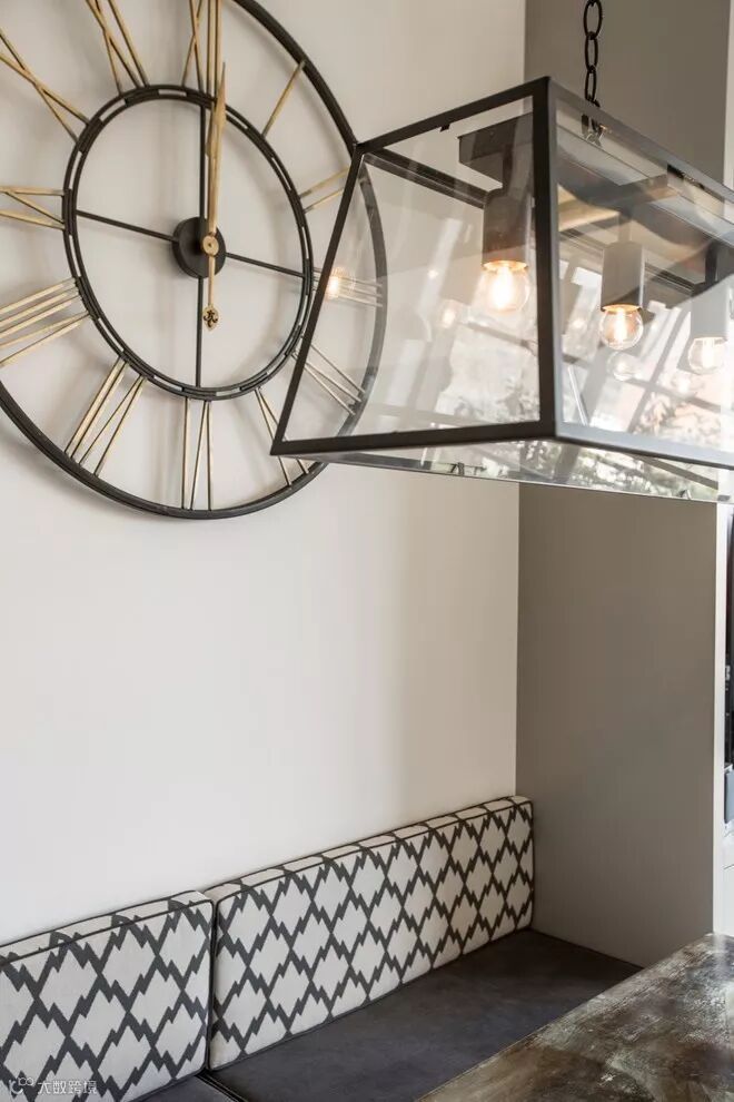 圆形线状的钟,这两年在各大国际家居展中也频繁出现,颜值还是颇高的。下图中和梯形的灯,还有几何图案相互呼应成趣,妙不可言。