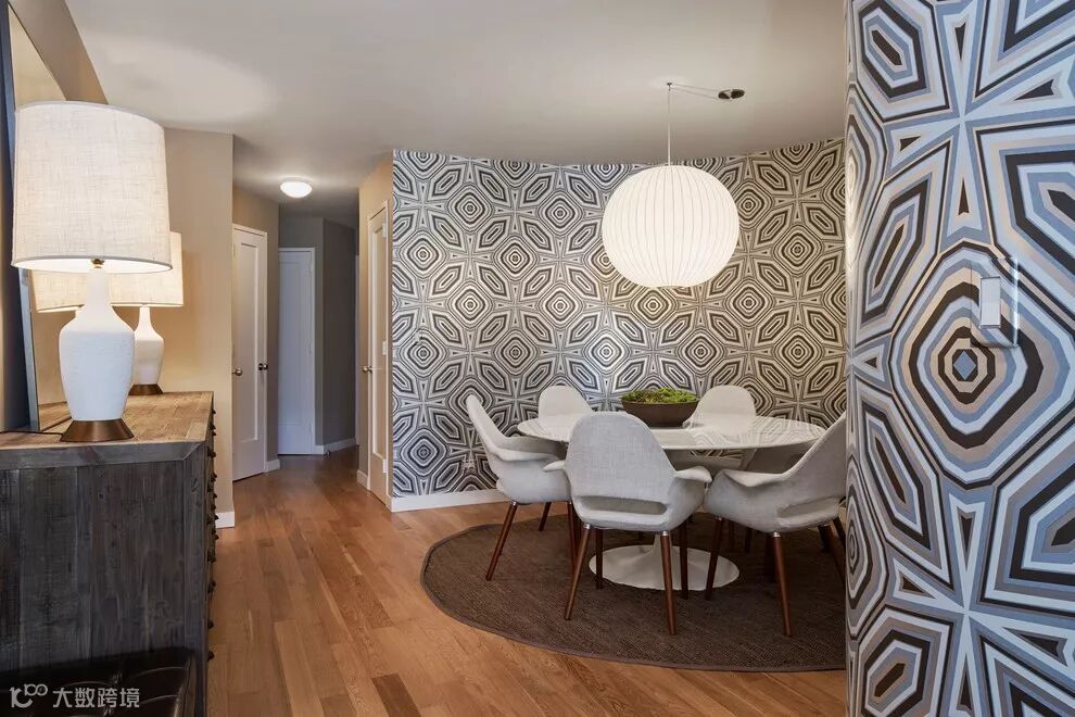 相对墙漆需要调色,几何壁纸的显然可以用的更放心一些,毕竟大牌的壁纸配色都是有大师或者专业人员组合搭配好了的。