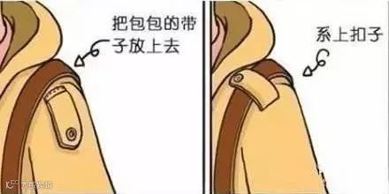 每次穿风衣背单肩包的时候,因为风衣面料太滑腻,包带总是往下滑落,这时可以把肩带的扣子解开,把包带挂上去,再把扣子扣好,就可以防止包包的肩带滑落了。