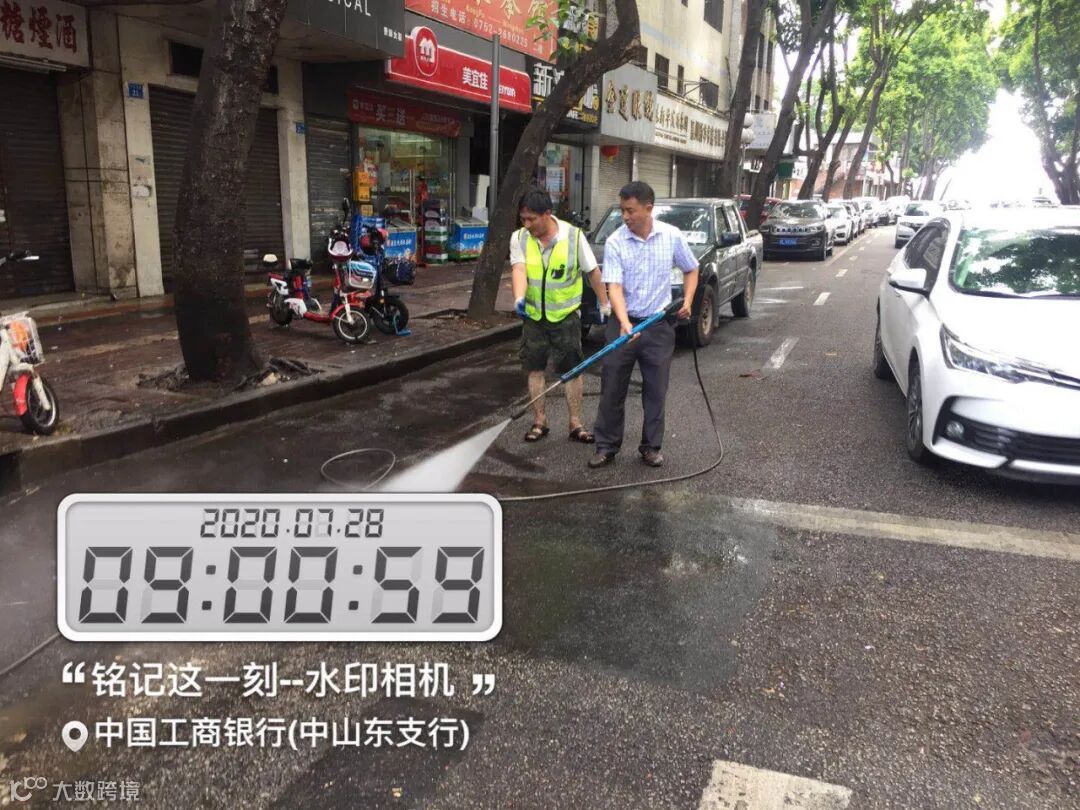 (管理人员指导冲洗中山东路油渍污染点)