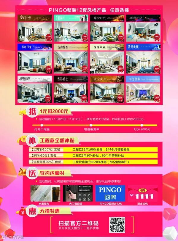 赢大奖凡活动期间预定PINGO整装签订认购协议,并缴纳定金,即可高抬贵手,参与砸金蛋赢丰富大奖,全屋墙布、大门智能锁、PINGO国际大礼包、现金红包机会等你砸!