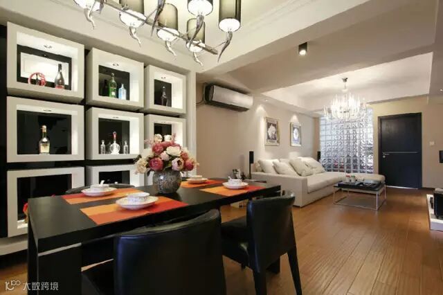 看到没,进门玄关这里的间隔是电视背景墙一起延伸过来的哦。玄关鞋柜后面就是厨房啦~