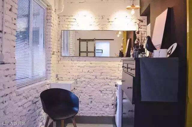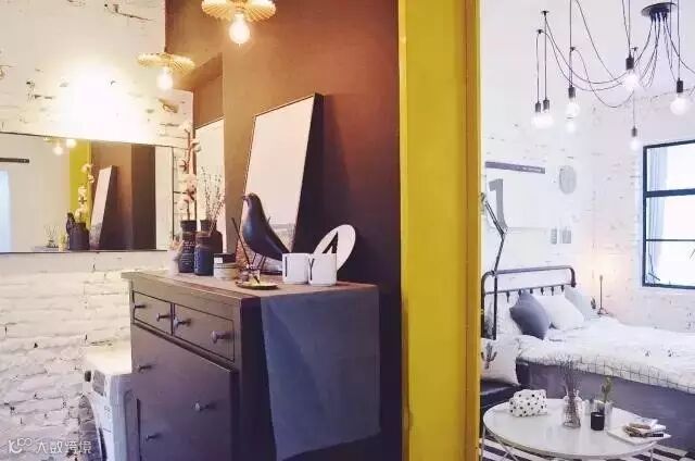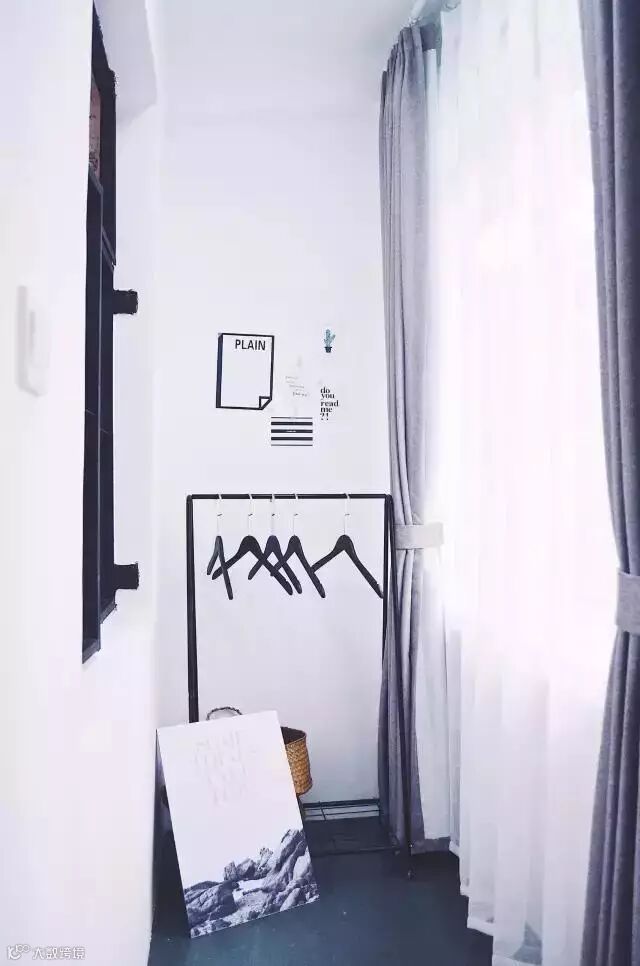 两层窗帘遮挡住室外形成了相对封闭的一个衣帽间,原来放置大衣柜的地方变成了黑色简易晾衣架,另一面则是一块落地穿衣镜。虽说是工业风但整个空间都显得很轻便、不沉重即使墙砖做旧都不减时尚感。