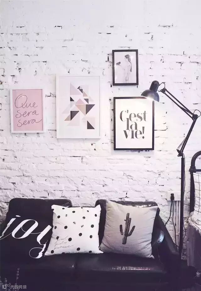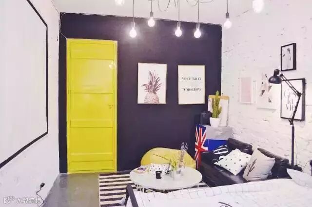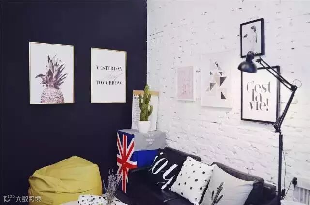 先看看沙发区域,主色调仍是冷淡的黑白灰,黄色的懒人沙发、米字旗装饰图案、墙上冷色调的艺术画,正一点点中和空间的疏离感。
