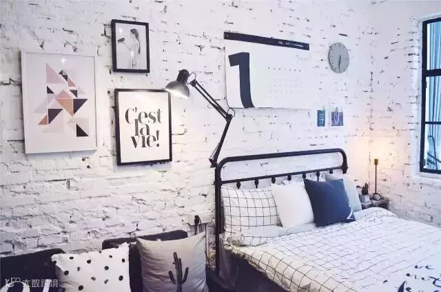 角落里的仙人掌与茶几、抱枕的仙人掌遥相呼应,铁框置物篓位于沙发和床铺之间,风干的植物因为能增添室内格调而逐渐流行,方格床品似乎和墙面的斑驳砖块,有异曲同工之妙,铁架床样式简洁与房屋整体基调相匹配。
