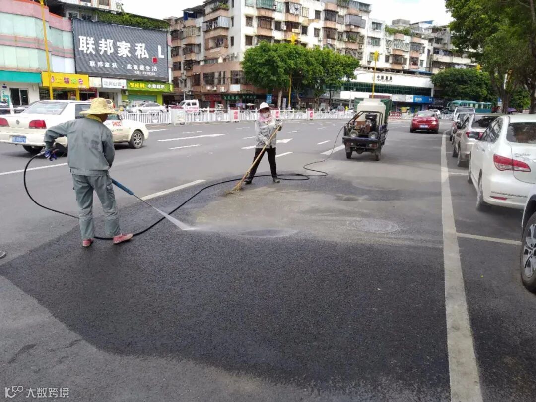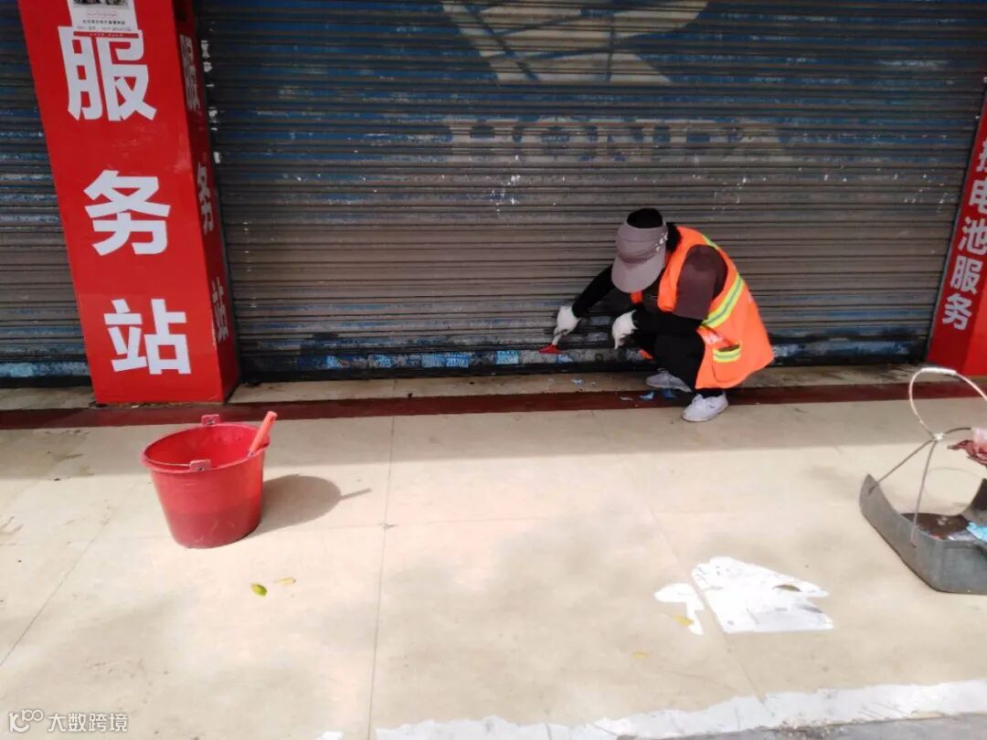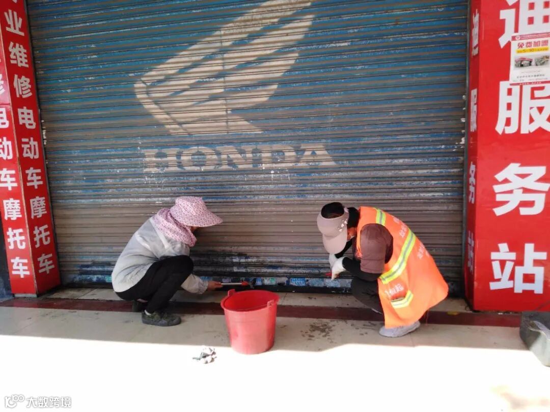 全面清理乱贴小广告,排水沟堵塞,冲洗城区人行道路面。
