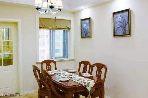 开放式餐厅,宽敞明亮,原木色桌椅舒适美观,符合美式的一大特色。背景墙以浅色彩为主调,两幅白兰花装饰画十分美观,给人身心的一种放松。
