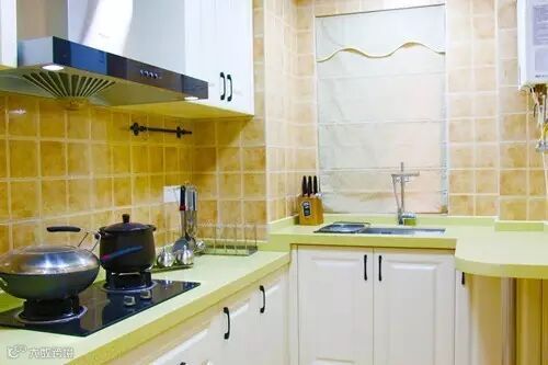 美式风格的厨房装修,呈现古朴自然的设计,白色橱柜与深褐色墙砖想搭配,没有夸张的装饰,更多的是现代感十足的简约。
