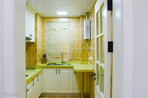 木质橱门让整间厨房都显出经典的美式风格,,水槽前的窗户正好使室外光线照射进厨房内,给这间厨房带来了不错的采光效果。