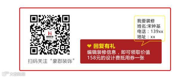 活动落地前关注豪郡装饰公众微信平台后回复,“我要装修,附姓名,装修地址、面积及手机号”即可领取价值158元的设计费抵用券一张